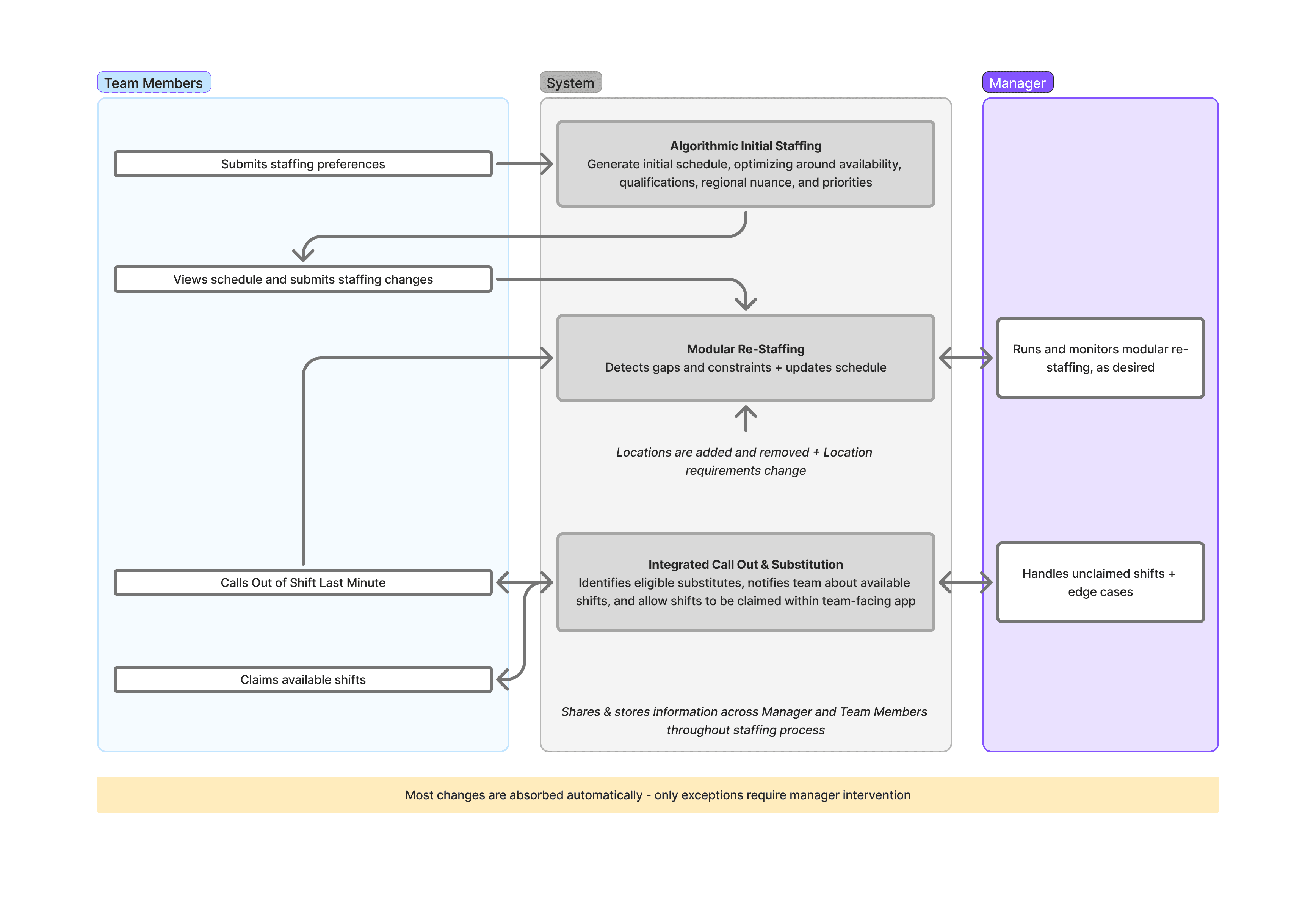 Solution: A layered staffing system combining algorithmic initial placements, modular weekly re-staffing, and integrated callout handling within a staff-facing app.