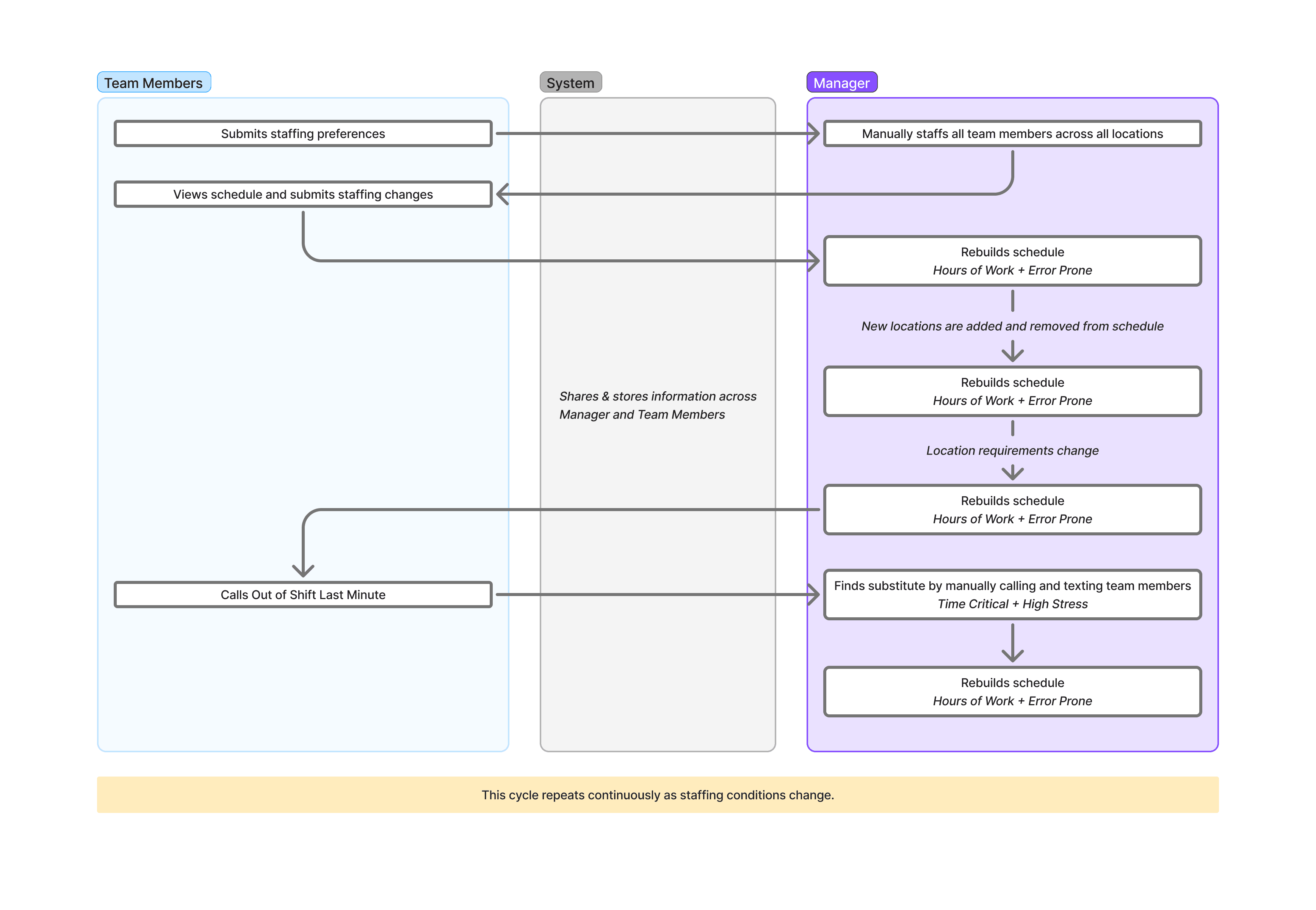 Staffing was brittle and manual. Coverage gaps, frequent callouts, training requirements, and inventory constraints made reliable staffing at scale difficult without heavy operational effort.